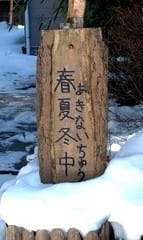 写真右:雪中に埋もれた有明神社再興の祖像(高さ約2メートルの台の上)
