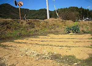 同じ日。ジャガイモやカボチャ、失敗した小玉スイカやメロンの元畑地に「お疲れ様」ともみがらを散布