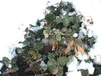 写真右:その傍らを覗くと、五色かずらが厚い雪の帽子を被り頑張っていた