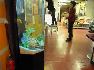 ポスターの貼り替え中。熱帯魚がゆらゆら。