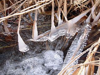すすきの茎が倒れ、ぶらさがった穂にたまった水滴が凍ったようだ