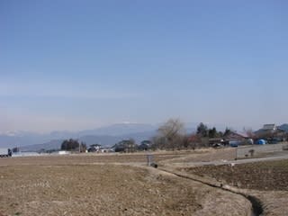 大きな田園風景。はるか彼方にうっすら雪をかぶる山