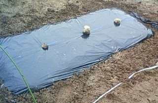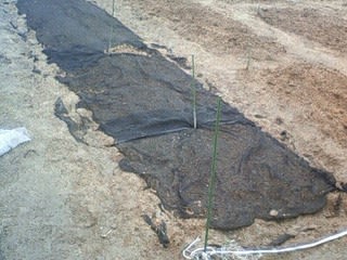 枝豆は、1畝2列で20穴。5粒ずつ種を播いた。不織布がないのでとりあえず古い黒寒冷紗をかけて鳥対策。