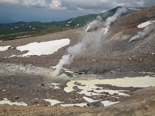 旭岳5合目から6合目にむかって登ると、地獄谷の噴煙が