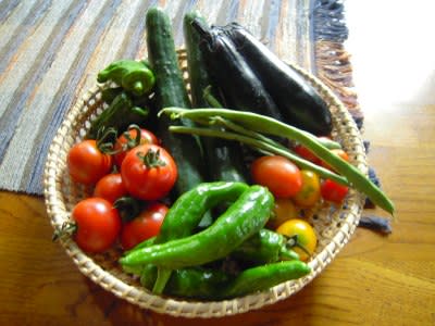 最近の野菜の収穫。手前の万願寺とうがらしは、焼いてよし煮てよし揚げてよしで、重宝してます