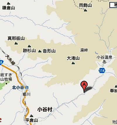 長いトンネルを超えるとすぐ東に入る「→小谷温泉」の看板あり。