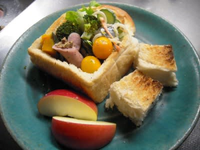 パンの耳を額縁に見立て、中にサラダや温野菜、茹でたウインナーなどを詰める