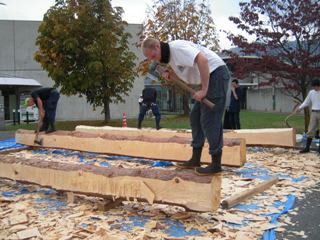館外では丸太切り実演中。近寄るとノッポの外国人で、ノルウエー出身の修行1年の青年。