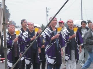 雨が降り始めた中おごそかに進み、祝詞や長野市から来られたメンバーで「木遣」も披露された。