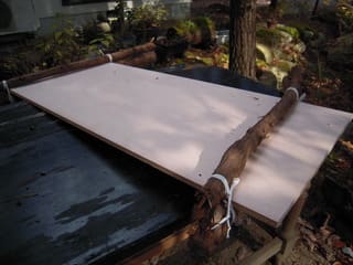 いざ土を取りだす時に、4枚のパネルを持ち上げられるよう杭をむすびつけた。