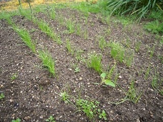 成長するかどうか未知数のネギの苗。間引きするのかなぁ?