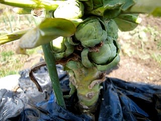 残骸に等しい芽キャベツ。越冬中に葉が傷んできたので、サラダに生で、炒めたり煮たりして頂いてしまった。
