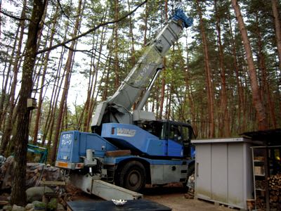 ②大きなクレーンを、細い道路と小さい敷地に搬入し、固定位置を確保する。