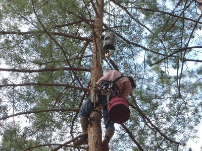 若手スタッフAさんが幹に足をタッチさせながら吊り具とともにスルスルと上昇し、程よい位置にロープを留めるつける。