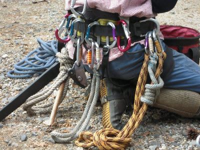 Aさんの腰には、樹上で何ごとが発生しようとも対応できそうな七つ道具が、頑丈そうなカラビナに収まっている