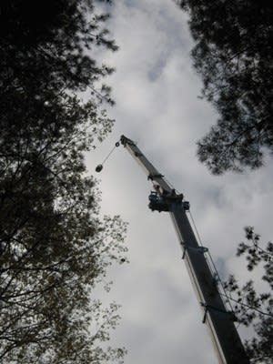 ③目印をつけた伐採赤松のそばに、クレーンの先端から引っ掛け具が吊り降りてくる。