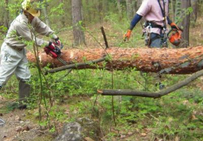 ⑥空き地に降ろし、すかさずCさんが枝を払い4メートルづつ切断する。手の空いた人も加勢する