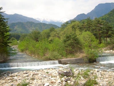 残雪の北アルプス、表銀座がうっすらと。中房川は雪融け水を大急ぎで犀川へ運んでいる