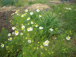 昨年、虫よけに植えたカモミールの花が、あちらこちらに増殖し甘い香りを漂わせている。草引きの合間にほっこり。