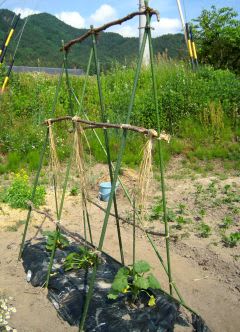 かぼちゃの吊り棚の準備が半分できた。まもなく残り半分を。