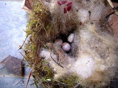 引っ張り出したところ、なんと綿様な物や枝で出来た巣に卵が5個。