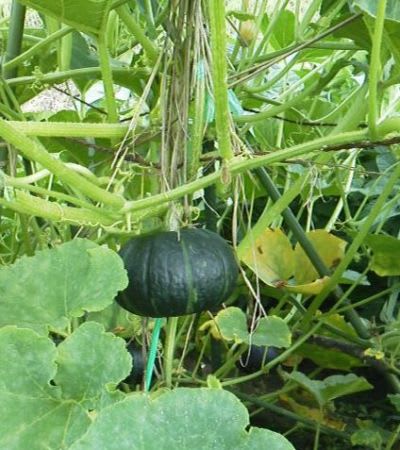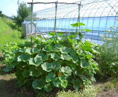 懸案の吊り式カボチャ栽培。子ヅルを切り少数精鋭主義とした。
