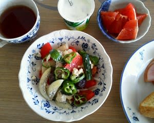 畑の野菜、トマト、万願寺とうがらし、ジャガイモ、タマネギに安曇野「俵屋 塩こうじ」をのっけてとコショウをふる。