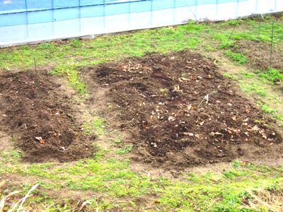 昨年出来た腐葉土と一緒に残りの枯葉も、冬越しの畝に混ぜた
