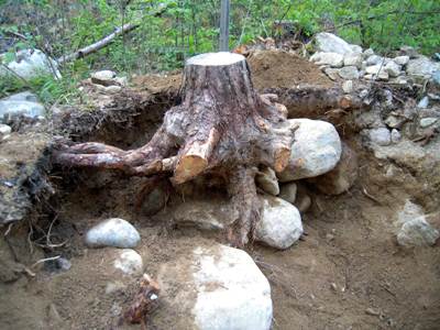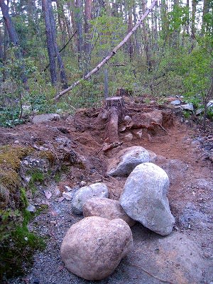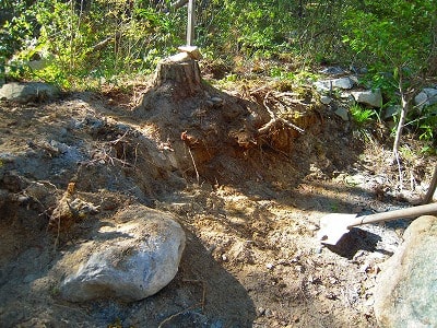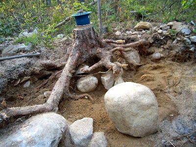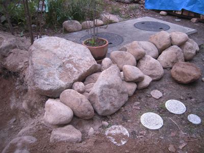 手前の平たい石の高さにあわせ、中小の石と土を埋め戻す。