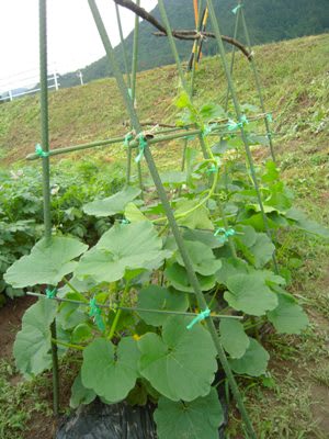 出遅れたかぼちゃもなんとか花が咲いた。今年も蔓はつりさげ式を採用