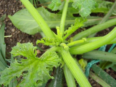 ズッキーニは1株だけ。毎年葉が茂りすぎるので、肥料を控えて木灰を撒いてみた