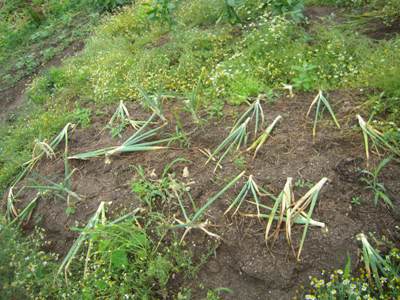 タマネギの葉がそろそろ倒れてきたので、収穫は近い。