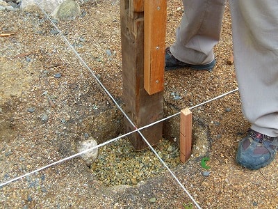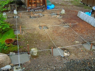 敷地に糸を張り沓石ブロックの位置を決め、穴を掘る。この時の画像をなぜか紛失。