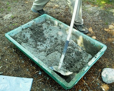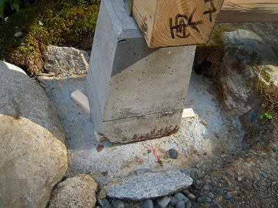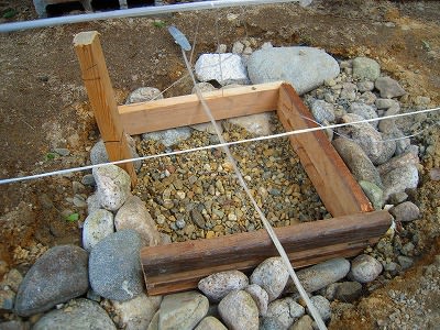 その小石と市販の小石と混合利用し隙間を埋め、沓石ブロックの寝床とする