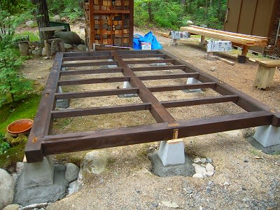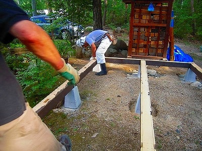 根太を土台枠にビス止めし、残りのコンクリートを流し、基礎工事完了。