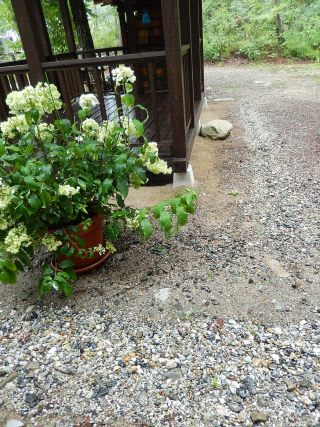 慎重に断りを入れ、東屋側のみ白っぽい小石を少し掘りだしバラスを敷いてみた。