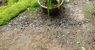奥の一部土の部分の溝は、割れたテラコッタ鉢の破片と掘り出したバラスで覆ってみた