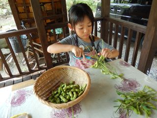 茶豆はまだ早かったが、膨らんだものをひとまず収穫し、さやとりは子供の仕事だ。