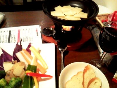 ラクレットチーズをスライスして小皿鍋で焼き溶かし、野菜をチーズに絡ませながら頂く。