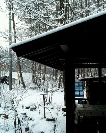 東屋の初冠雪です。そうでした1センチくらいの日が一度あったっけ。