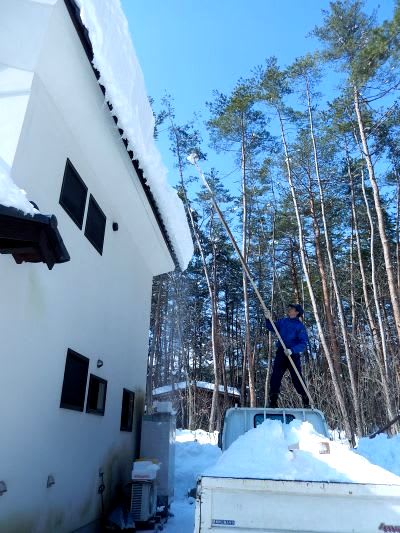 雪の重みで倉庫の戸が開けにくくなったので、雪おろし作業。