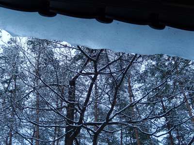 屋根の雪が軒先へずり落ち、木々の雪は姿を消しました。