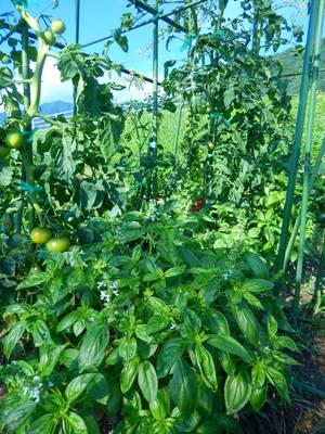 トマトのコンパニオンプランツとして、バジルを4株混栽してみたら、大繁盛です。