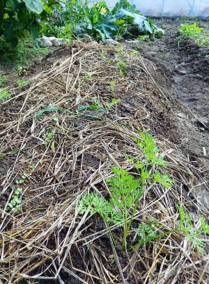 プラポットで芽出しして植えたニンジン。なんとか葉は伸びてきた。