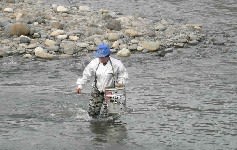 写真右:胸まである長ゴムズボンをはいて、川の中へじゃぶじゃぶ。遠くにいる白鳥にエサを投げた