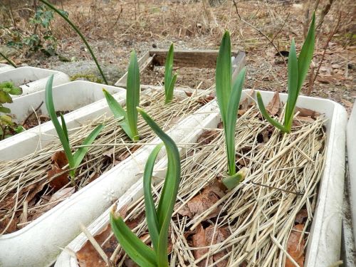 越冬して雪の下から出てきた庭のプランターのニンニク