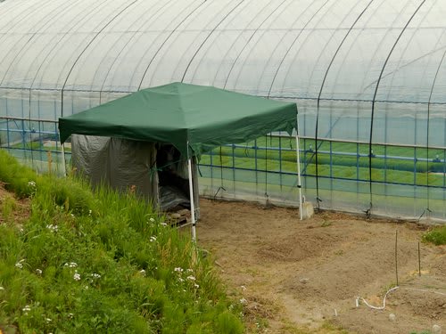 農機具や肥料の保管場所は、1台用サイクルハウスですが、夏の暑さには閉口する。