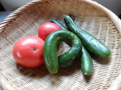 キュウリは特大サイズに困ったが、小ぶりよりは味がしっかりしており、納得で収穫。