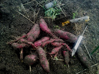 サツマイモ(べにあずま)の収穫時期がさっぱりわからないが、仮堀りしてみた。