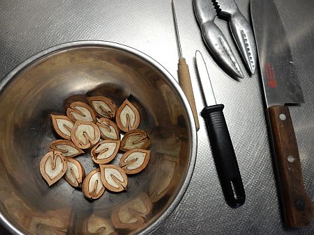 クルミの先っぽがわずかに開く。そこへ包丁の刃を差し込み割る。